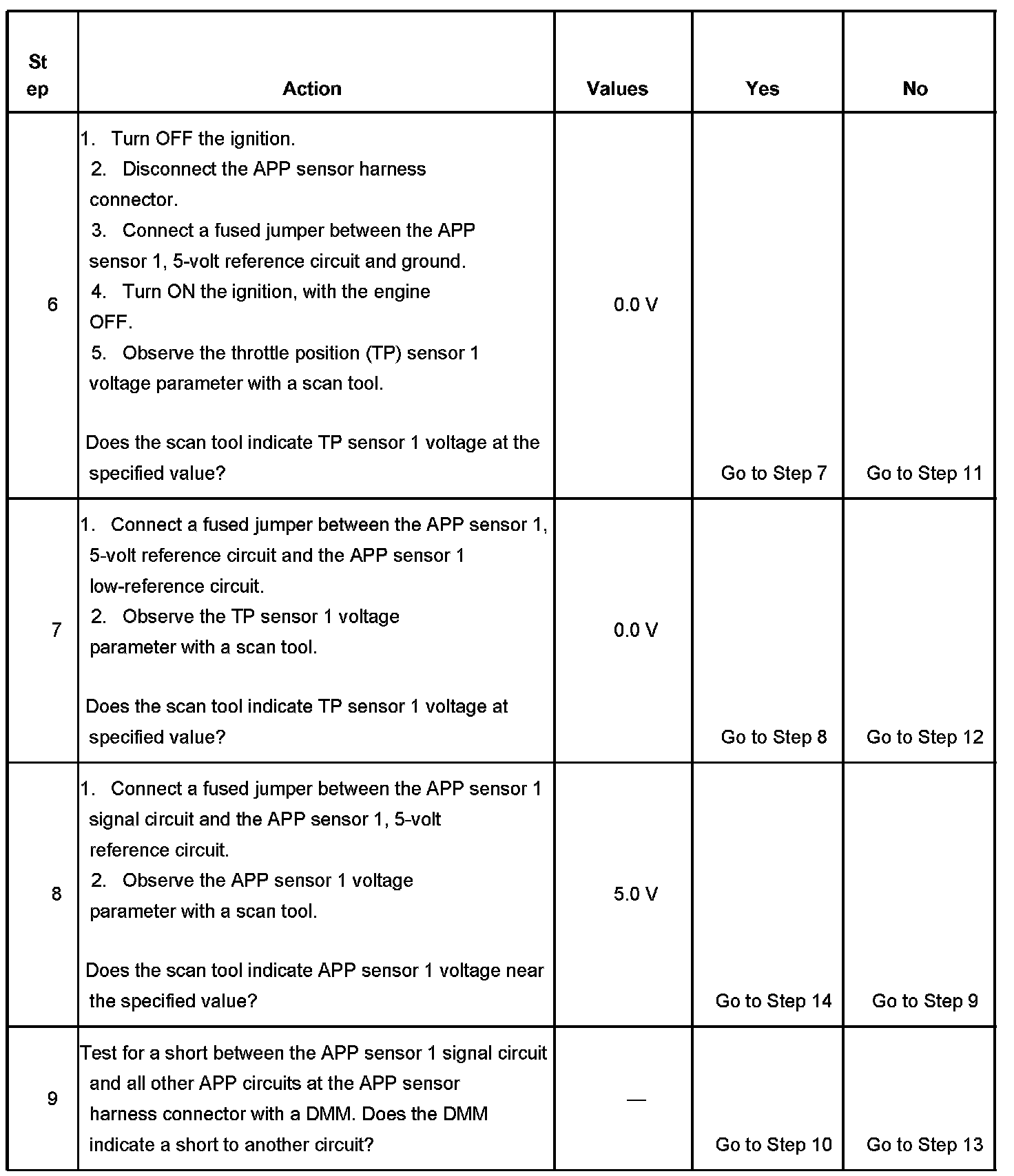 6. The APP sensor 1 shares a common 5-volt reference circuit with the throttle position (TP) sensor 1. Monitoring the TP sensor 1 voltage aids in diagnosing the APP sensor 5-volt reference and low-reference circuits. If the scan tool displays near 0 volts, the circuits are OK.