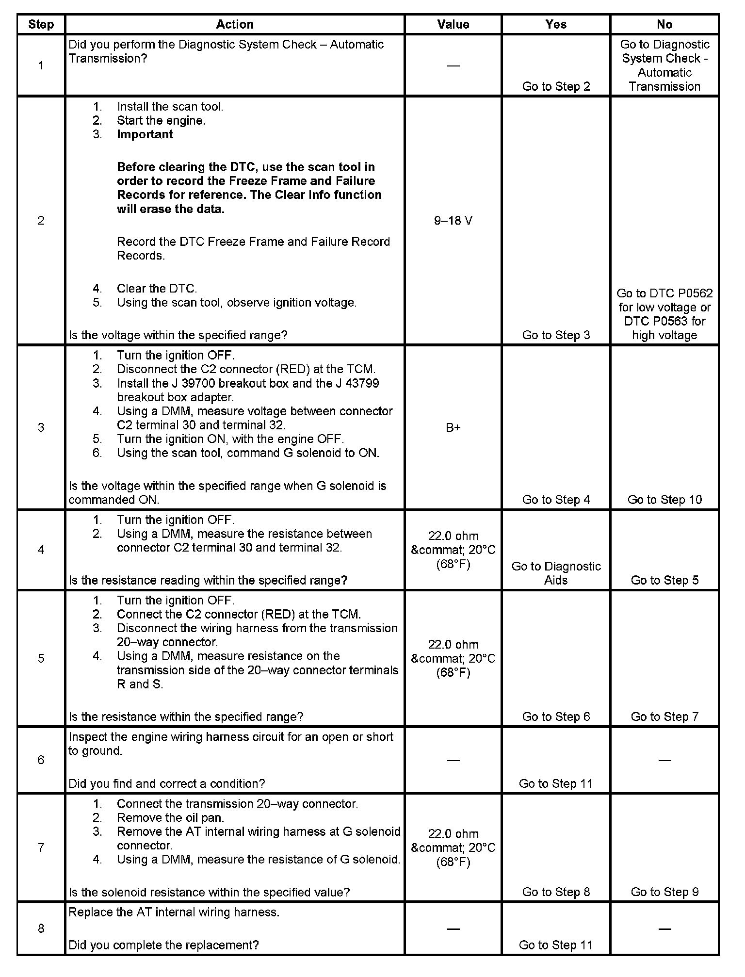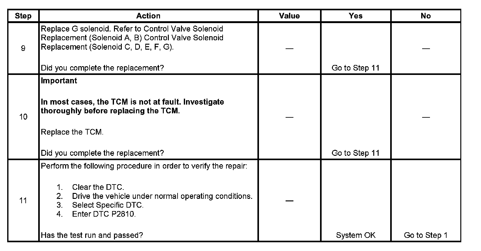 DTC P2810 is set when the TCM detects an open circuit, short to ground, or short to power at G solenoid circuit for greater than 2 seconds.