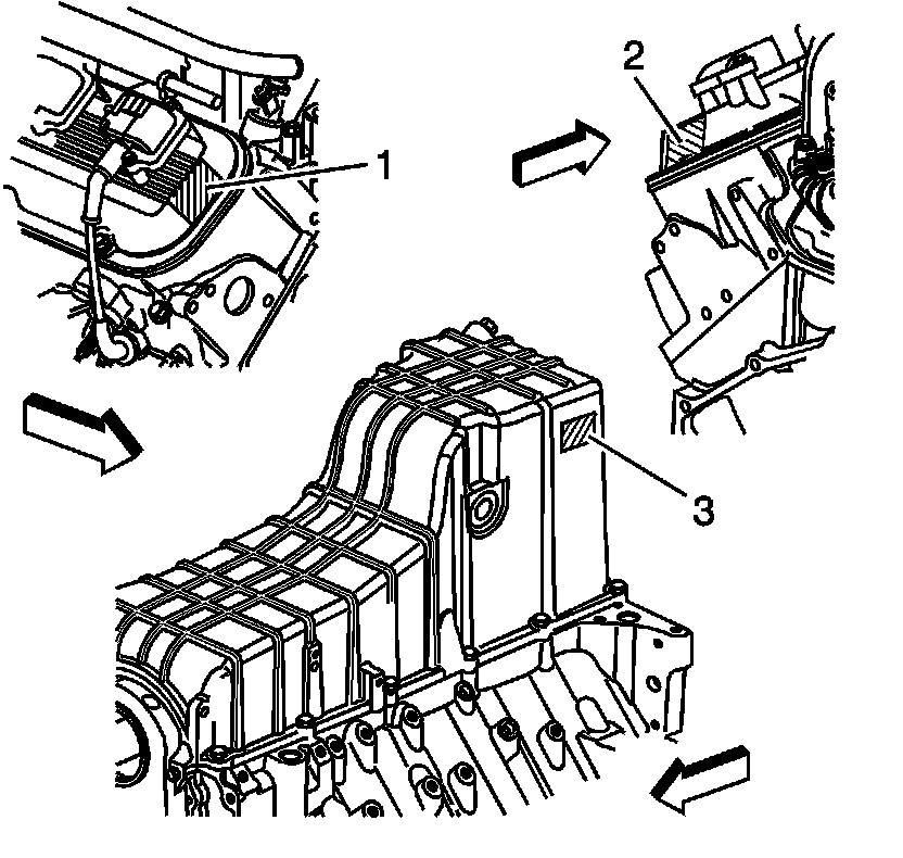 Engine IdentificationThe engine identification number is located in three locations. There are labels on the front of the right rocker arm cover (1), the rear of the left rocker arm cover (2), and the right side of the engine oil pan (3). The engine identification number is used to track and identify the engine prior to installation in a vehicle.