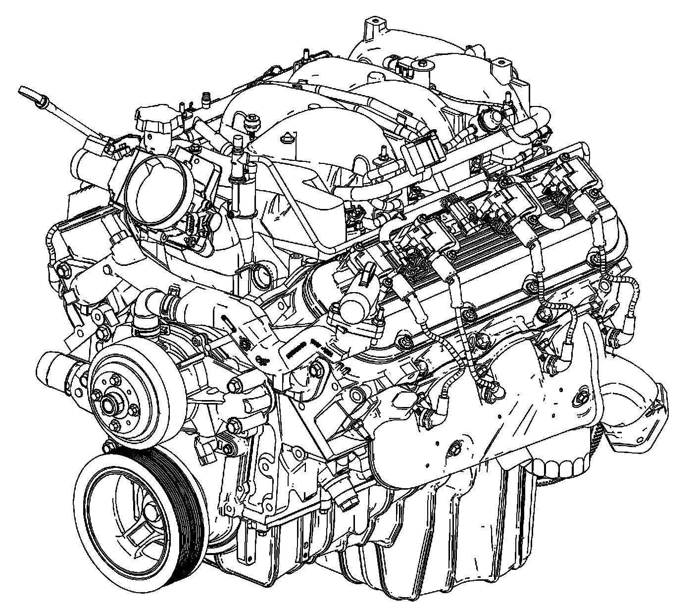 The intake manifold is a one-piece design. The intake manifold is made of cast aluminum. The throttle body is attached to the front of the intake manifold. The fuel rail assembly with eight separate fuel injectors is retained to the intake manifold by four studs. The fuel injectors are seated in their individual manifold bores with O-ring seals to provide sealing. A Manifold Absolute Pressure (MAP) sensor is mounted on the top of the intake manifold and sealed by an O-ring seal. The MAP sensor is held in place with a retainer bolt. The evaporative emission canister solenoid is located in the front of the intake manifold. The Positive Crankcase Ventilation (PCV) system is internally cast into the intake manifold. There is not a PCV valve. A splash shield is installed under the intake manifold. The shield prevents hot oil from contacting the bottom of the intake manifold, maintaining air inlet charge density.