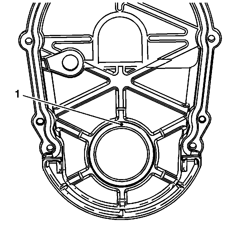 6. Apply a 3-4 mm (0.12-0.16 inch) bead of sealant GM P/N 12346286, (Canadian P/N 10953472), or equivalent in 2 sealant points (1) across the flange where the gasket ends at the bottom of the front cover.