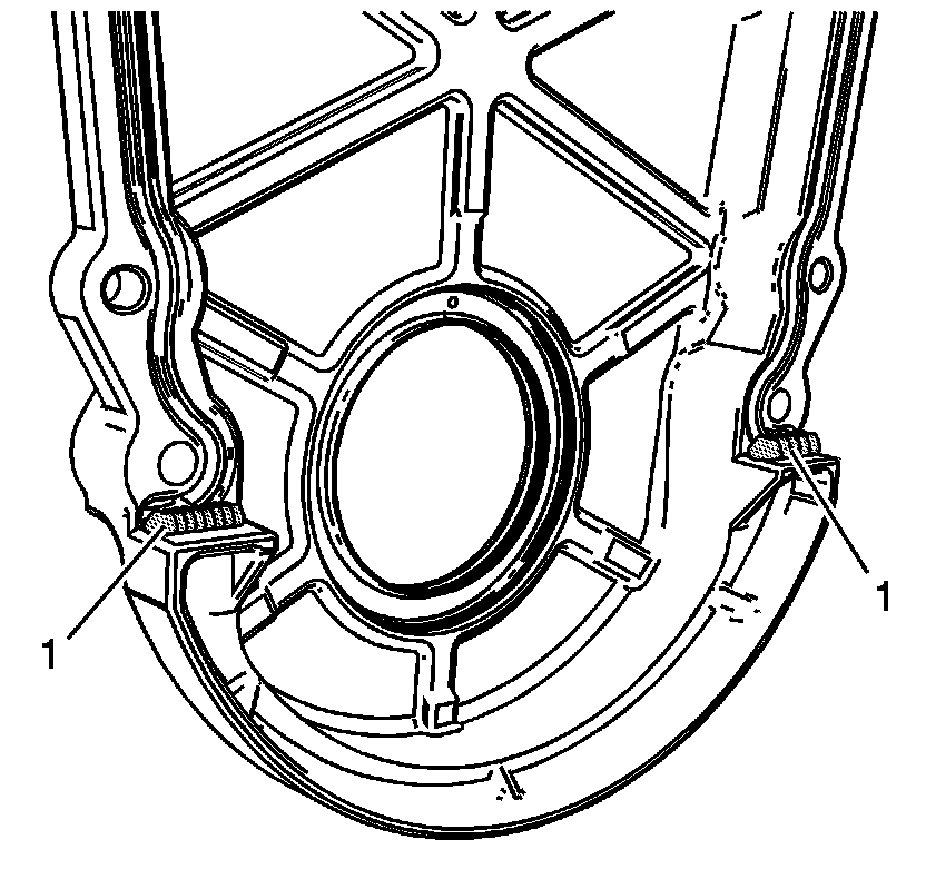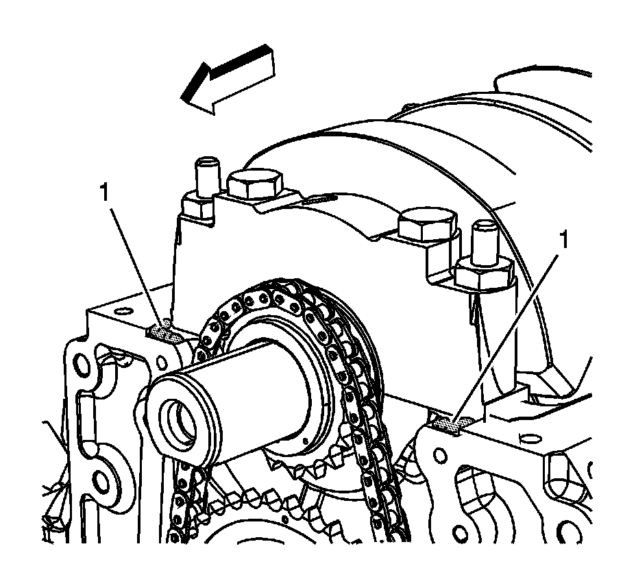 Apply a 3-4 mm (0.12-0.16 inch) bead of sealant GM P/N 12346286, (Canadian P/N 10953472), or equivalent in 2 sealant points (1) on the engine block where the front cover meets the oil pan.