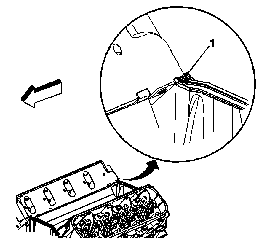 5. Apply a 5 mm (0.2 inch) bead of GM P/N 12346141 (Canadian P/N 10953433) sealer (1) onto the end seals at the 4 engine block/cylinder head locations.