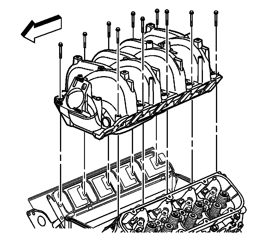 Important: The entire intake manifold tightening sequence must be promptly completed due to the anaerobic thread adhesive. The final pass of the tightening sequence must be completed before the adhesive starts to cure, or false torque readings and ineffective thread locking may result.