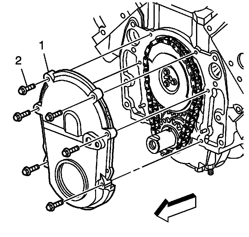 2. Lift the front cover (1) while sliding the cover over the crankshaft (2).