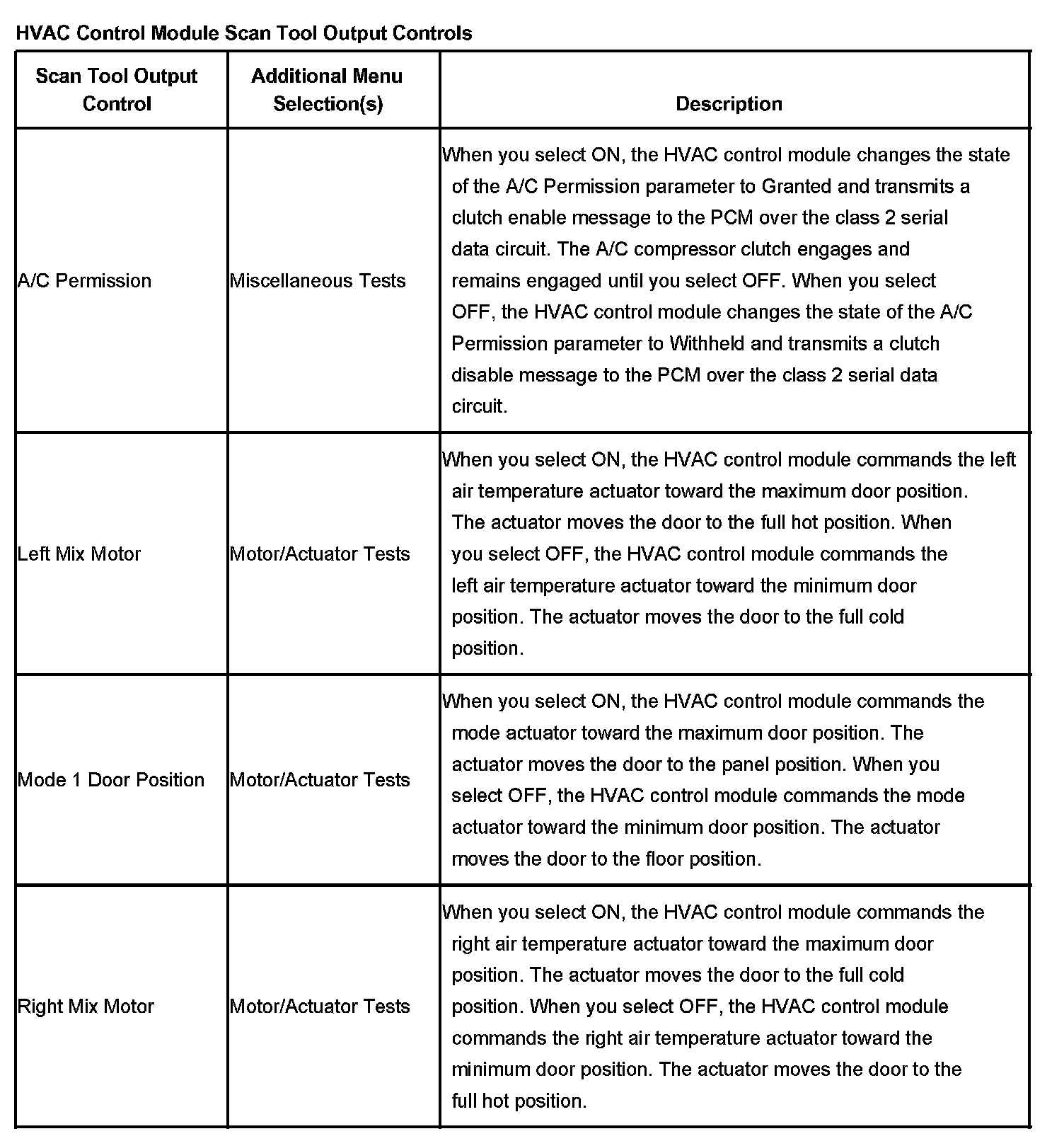 HVAC Control Module Scan Tool Output Controls: