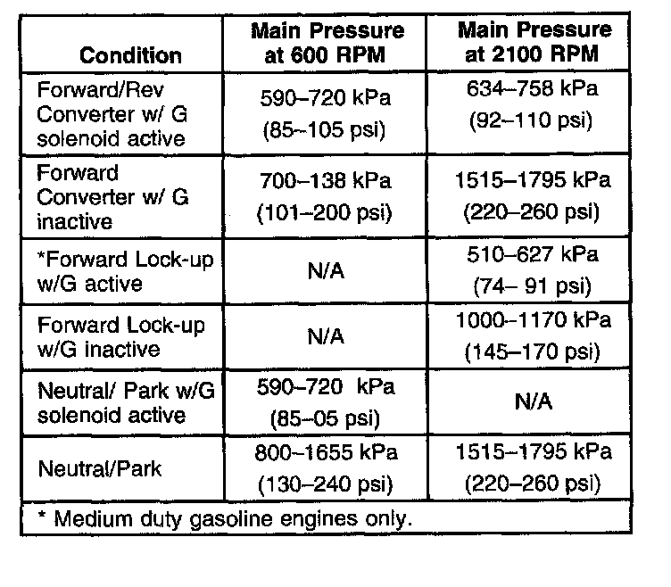 Modulated Main Pressure Schedule Table (Transmissions with Modulated Main "G" solenoid)