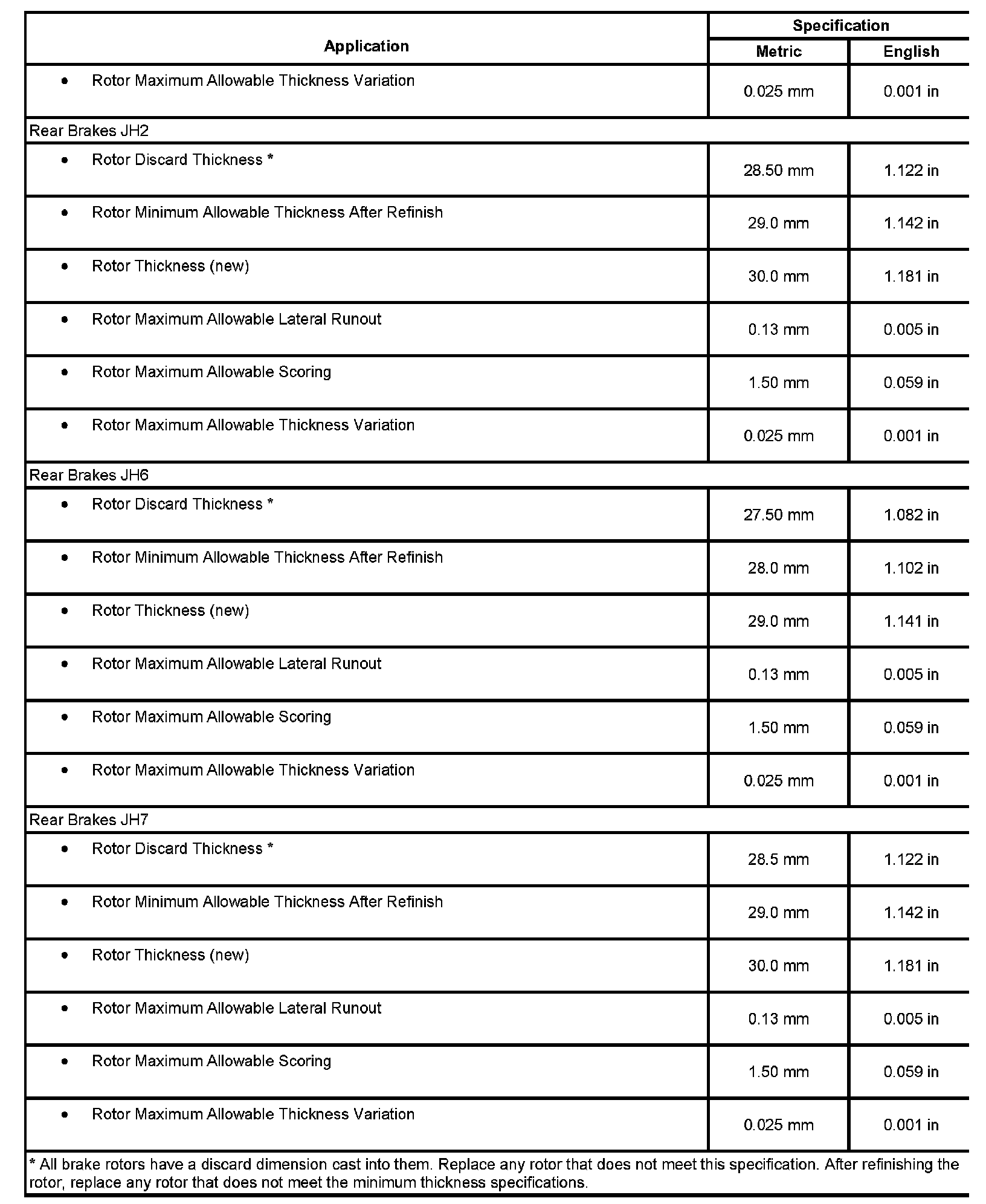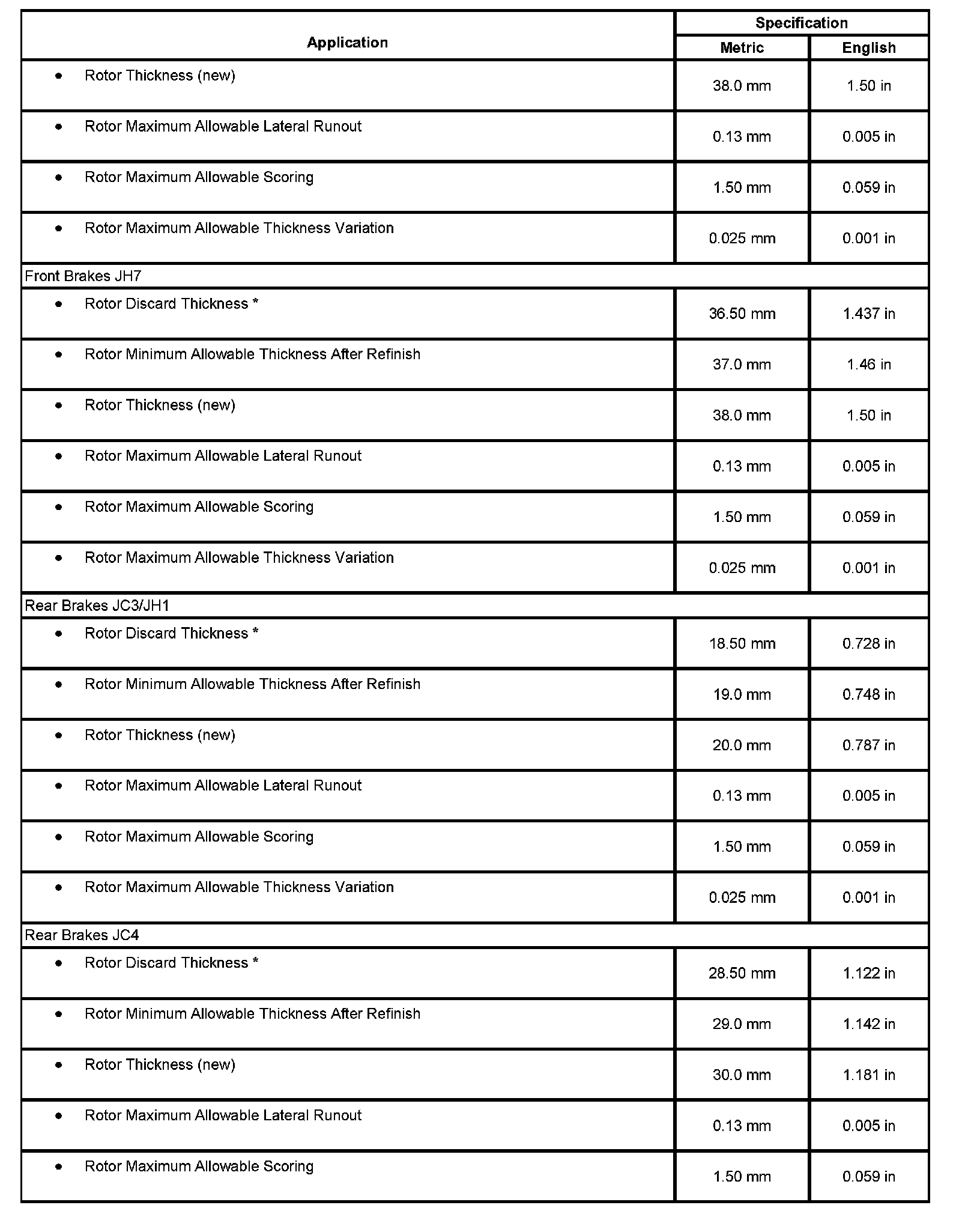 Disc Brake Component Specifications