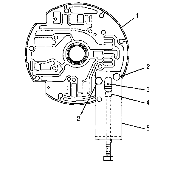 9. Using J24459-5 (4) and J43770 (5), compress the converter flow valve spring until retainer pin (3) can be installed.