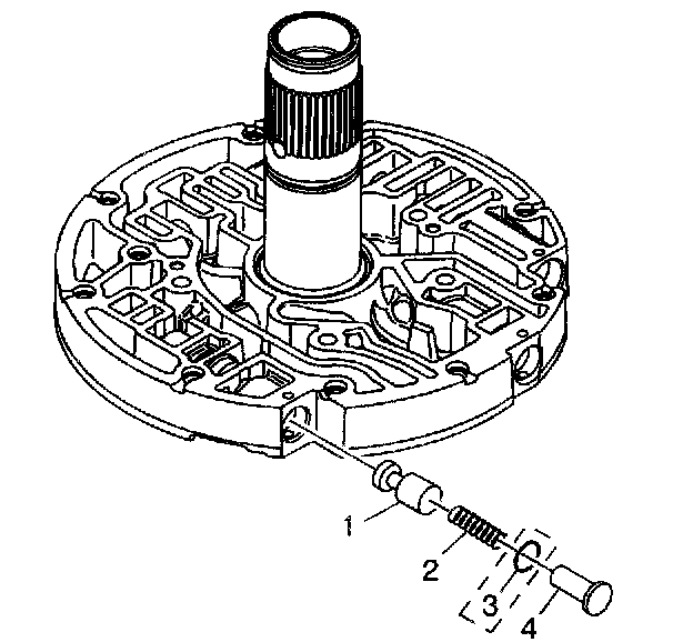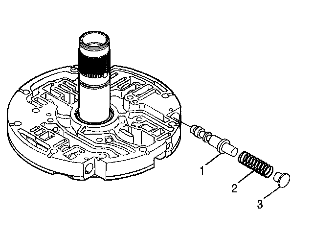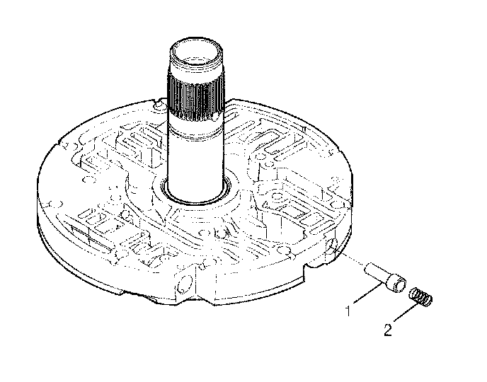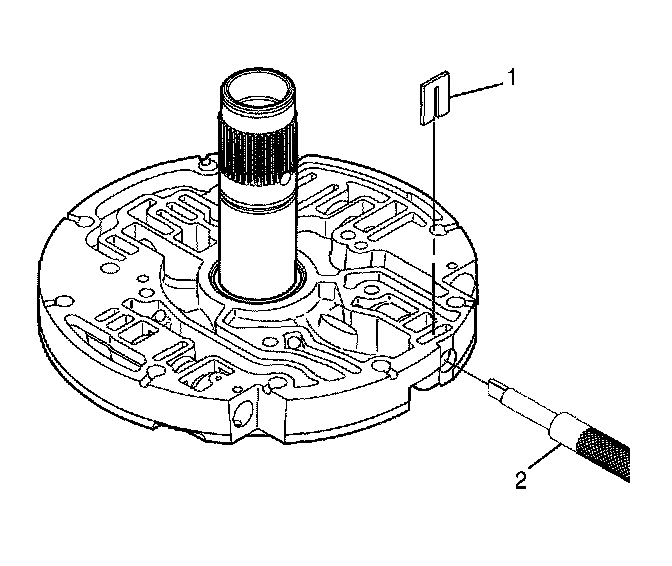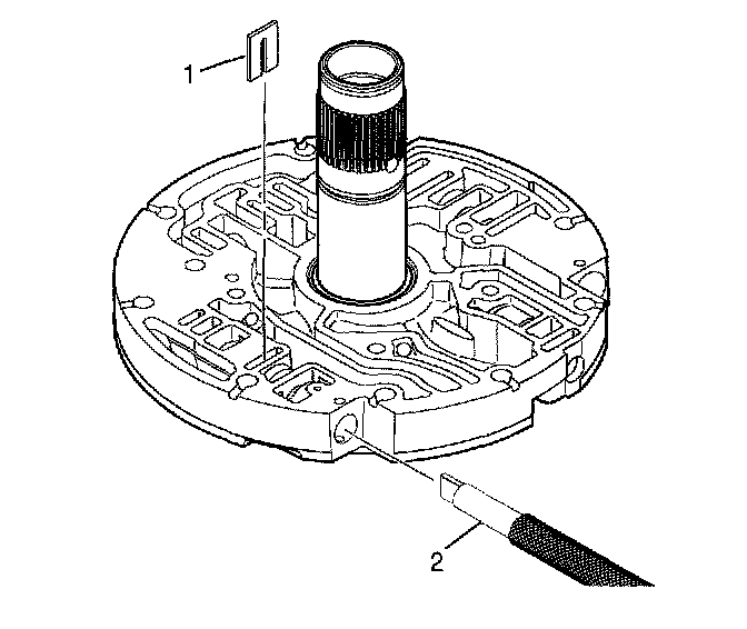 25. Using J43773 (2), compress the C1 clutch backfill valve spring until the retaining clip (1) can be installed.