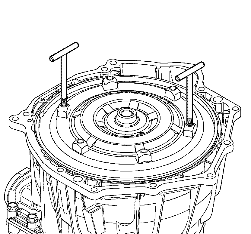 7. Install J 46409 Torque Converter Lifting Handles 180 degrees apart into two lugs on the front of the torque converter.