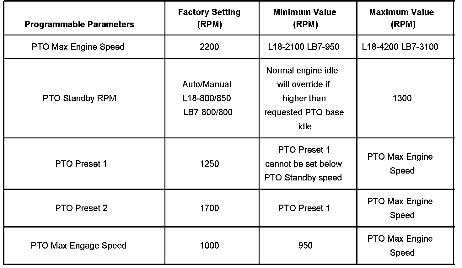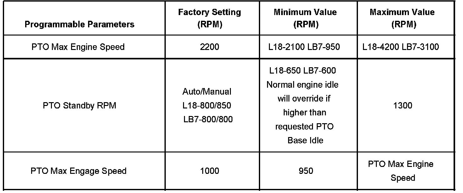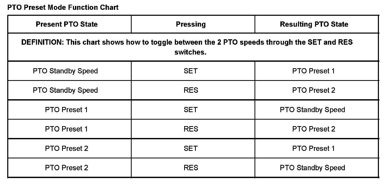 The PTO preset mode is used for stationary applications. PTO will remain engaged while mobile in the preset mode however PTO Preset 1 and PTO Preset 2 speed controls will be inoperative. The engine RPM will also return to normal. This mode provides a default standby speed of 800 or 850 RPM depending on the engine and transmission combination. This mode also provides 2 default PTO control speeds: PTO Preset 1 of 1250 RPM and PTO Preset 2 of 1700 RPM. Please note that the standby speed is not to be used as a PTO control speed. Vehicles not equipped with cruise control will not have the resume speed capability.