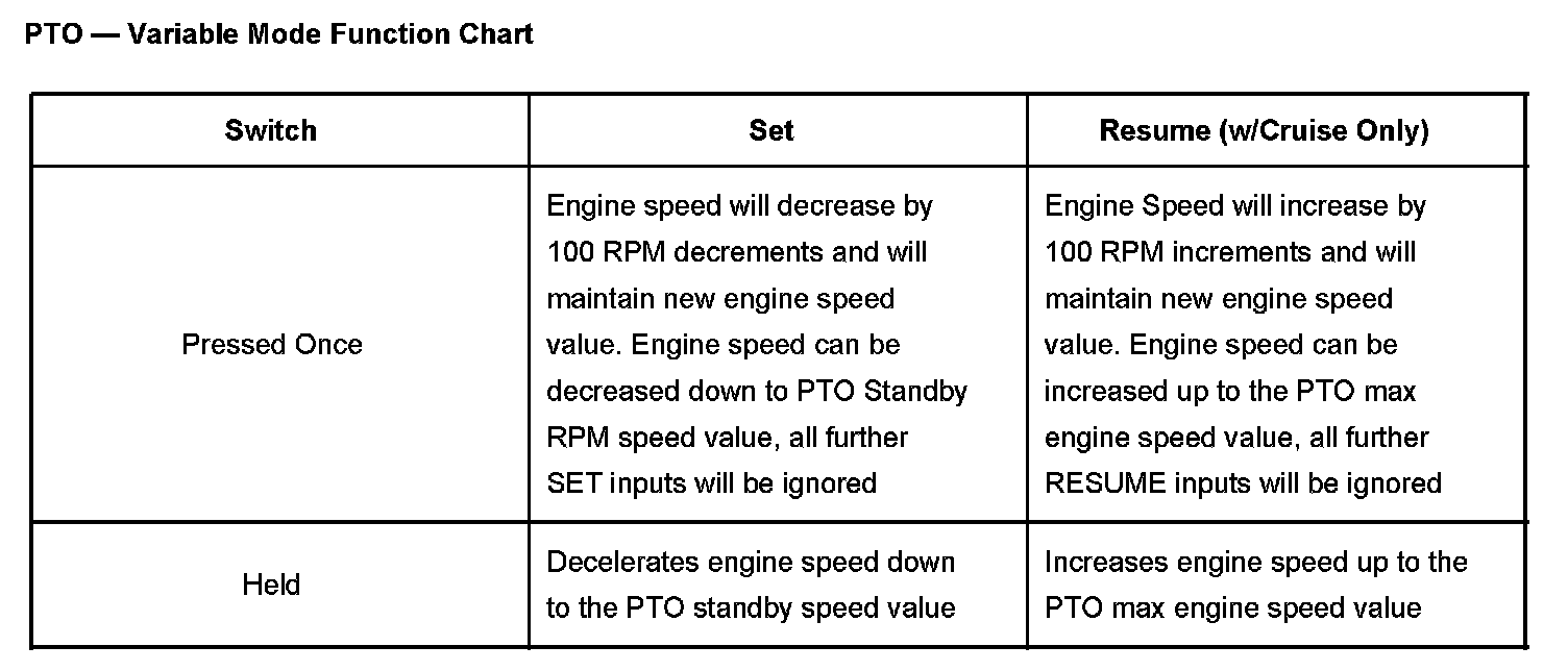 The PTO speed control mode is used for both stationary and mobile applications. This mode allows PTO to be controlled in a fashion similar to cruise control. The operator is able to hold an engine RPM between 800 and 2200 with the SET switch on the cruise stock or the PTO switch. The operator can "tap up" to increase engine speed in 100 RPM increments with the RESUME switch. The operator may also "tap down" to decrease engine speed with either SET switch on the cruise control multifunction switch or the PTO switch. Vehicles not equipped with cruise control will not have the "tap up" capability.