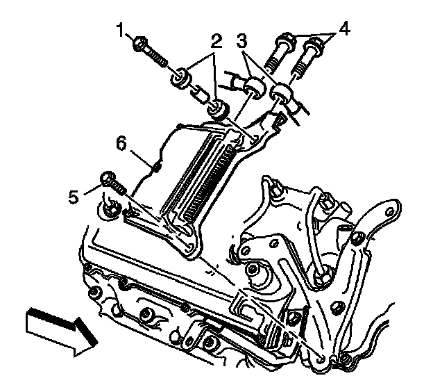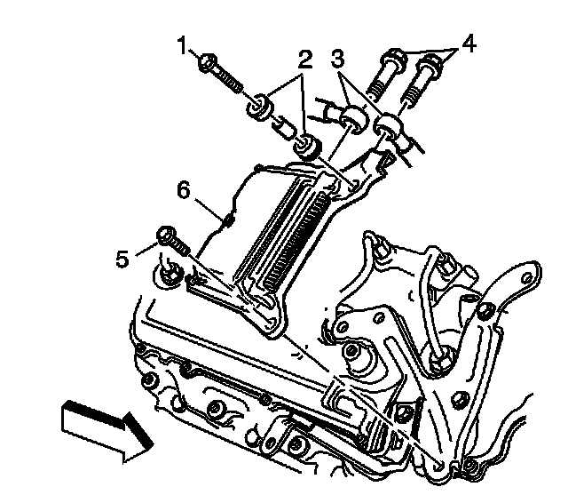 9. Remove the control module bolts (1, 5).