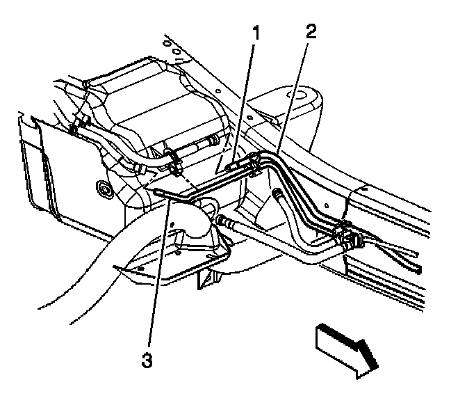 13. Disconnect the chassis fuel line from the short fuel line between the fuel sender and the chassis fuel line in front of the fuel tank (1).