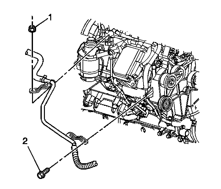 5. Remove the outlet heater hose bracket bolt (2).