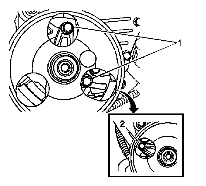 5. If equipped, position the vacuum pump. Install the EGR vacuum pump bolts (1, 2).