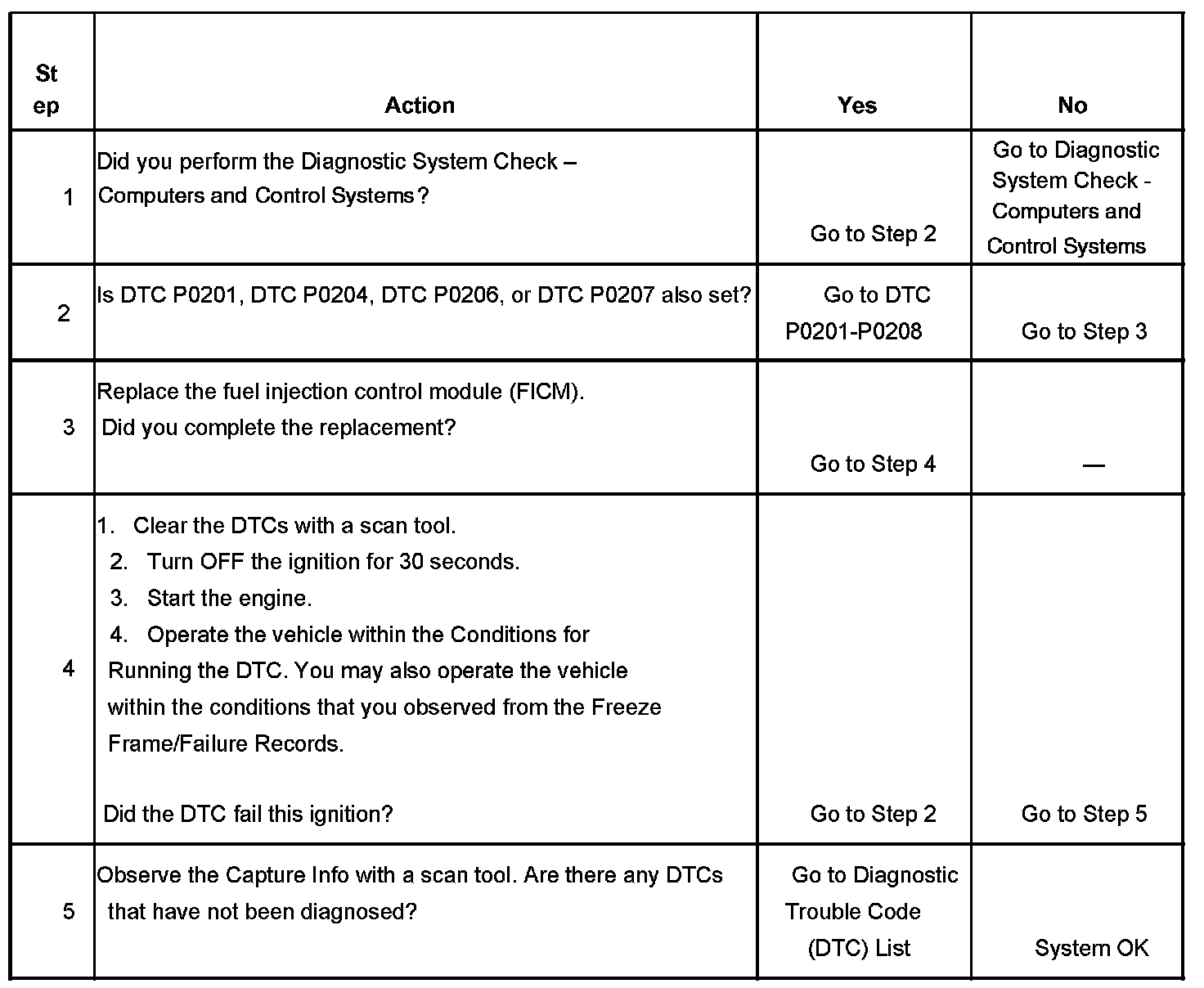 The fuel injection control module (FICM) supplies high voltage to each fuel injector on the ignition voltage circuits. The FICM energizes each fuel injector by grounding the command circuit between the FICM and the fuel injector. The FICM monitors the status of the ignition voltage circuits and the fuel injector command circuits. When a fuel injector circuit condition is detected by the FICM, all of the fuel injectors on the affected ignition voltage circuit will be disabled. If a circuit condition is detected on a fuel injector circuit for cylinders 1, 4, 6, or 7, DTCs P0201, P0204, P0206, P0207 will set, along with DTC P2146. If a circuit condition is detected on a fuel injector circuit for cylinders 2, 3, 5, or 8, DTCs P0202, P0203, P0205, P0208 will set, along with DTC P2149.