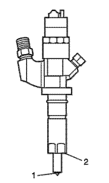 1. Use a soft bristle non-metallic brush and Top Engine Cleaner, GM P/N 1052626 or equivalent, to remove any deposits from the nozzle tip (1) and the copper washer sealing area (2) before re-installation.