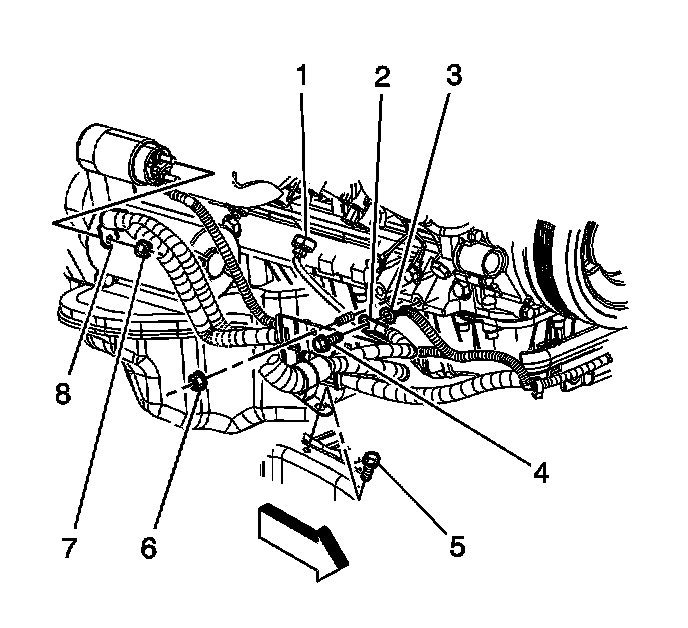 11. Remove the positive battery cable lead (8) from the starter.