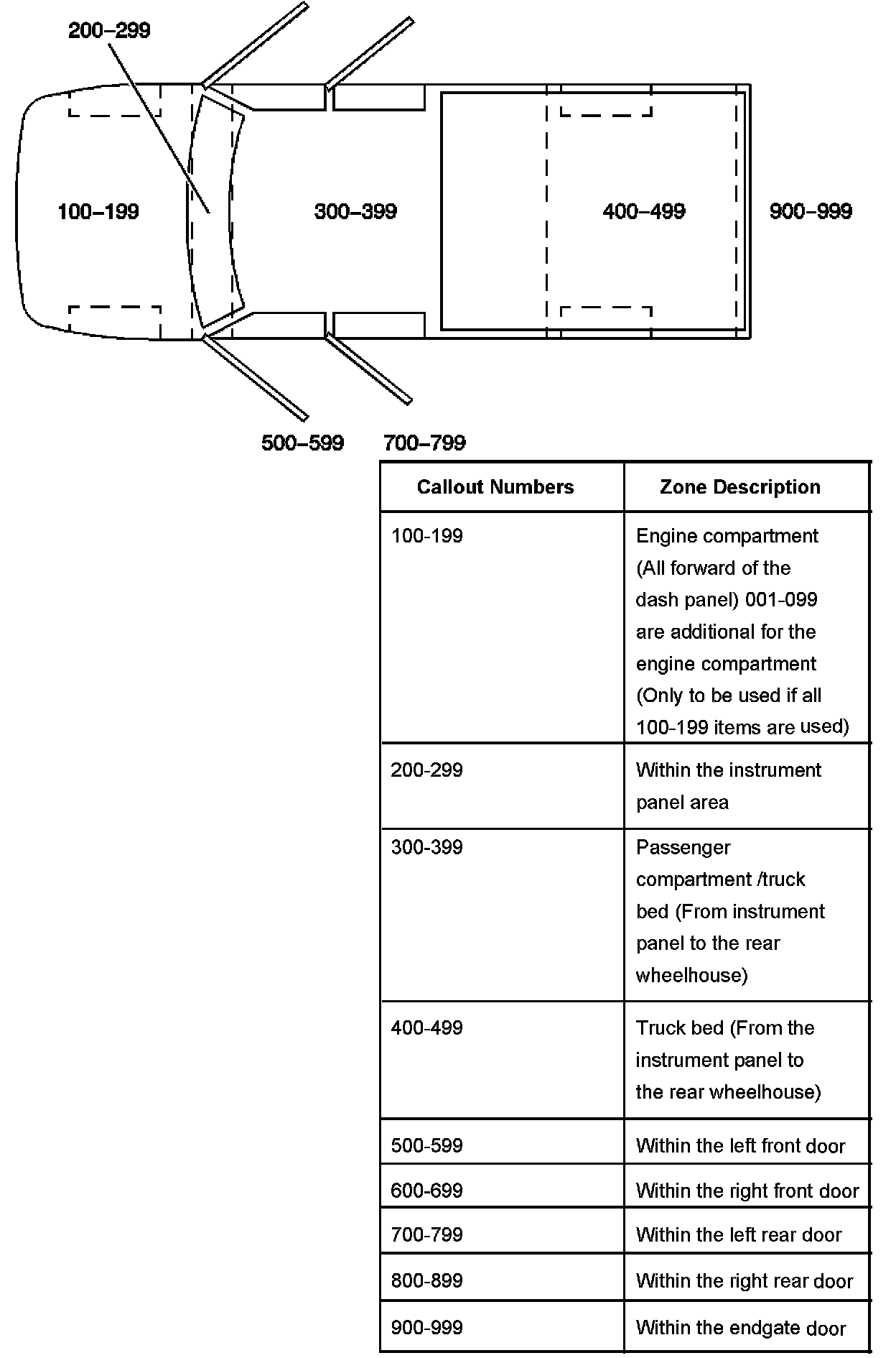 All grounds, in-line connectors, pass-through grommets, and splices have identifying numbers that corresponds to where they are located in the vehicle. The table explains the numbering system.