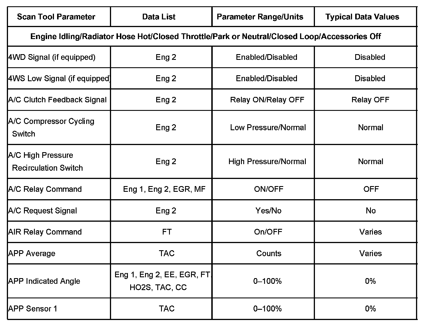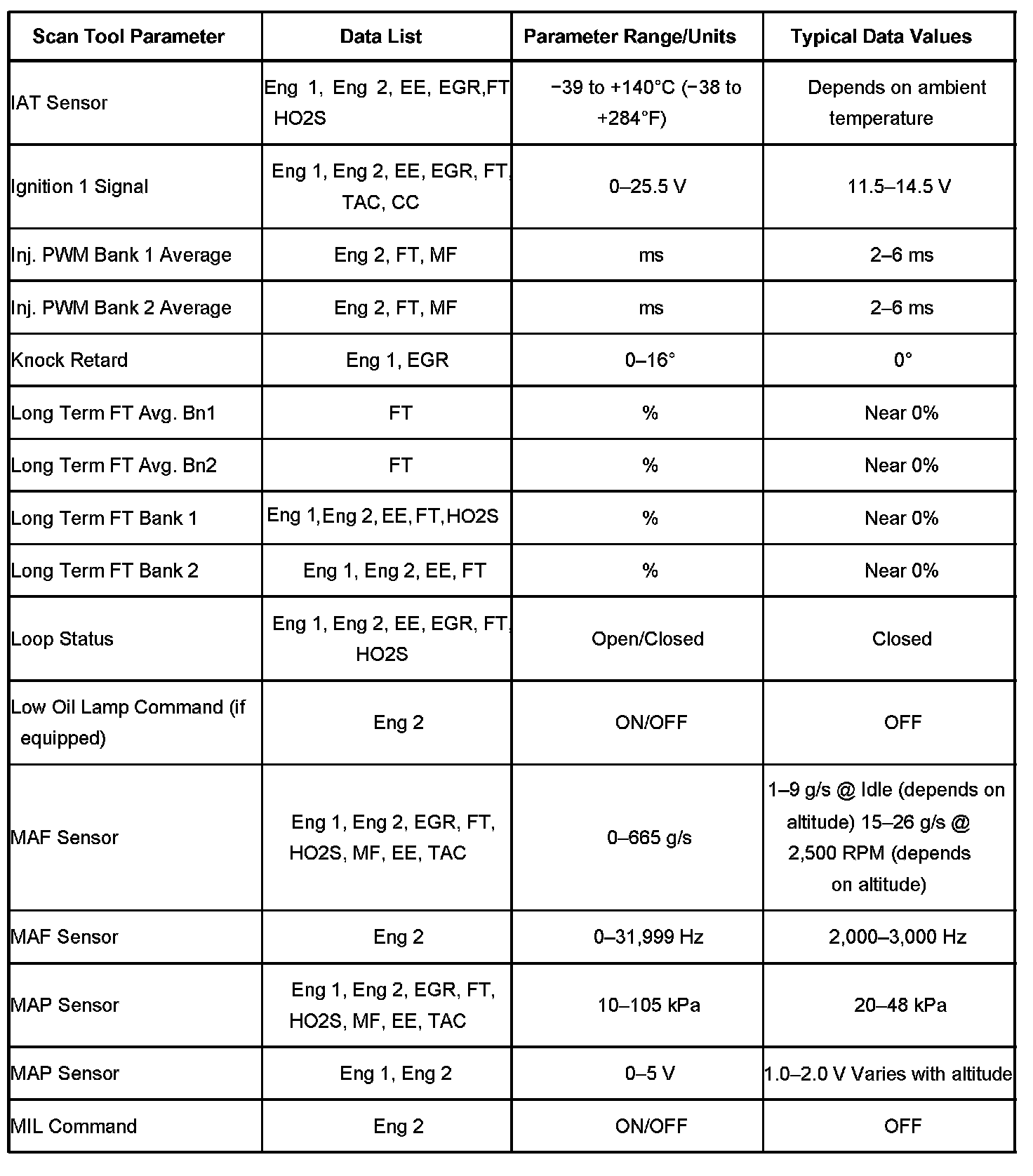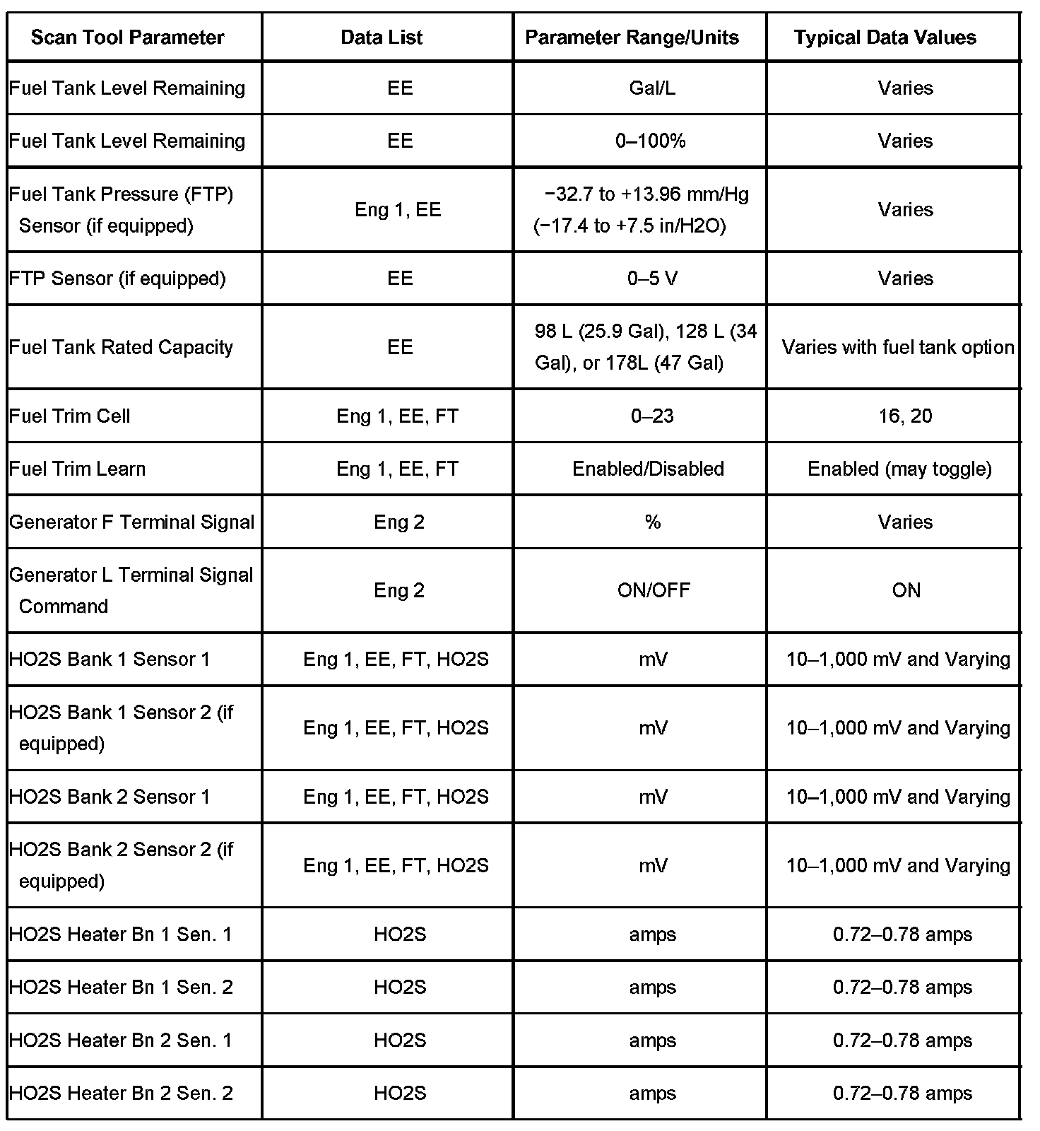 The Engine Scan Tool Data List contains all engine related parameters that are available on the scan tool. The list is arranged in alphabetical order. A given parameter may appear in any one of the data lists, and in some cases may appear more than once, or in more than one data list in order to group certain related parameters together.