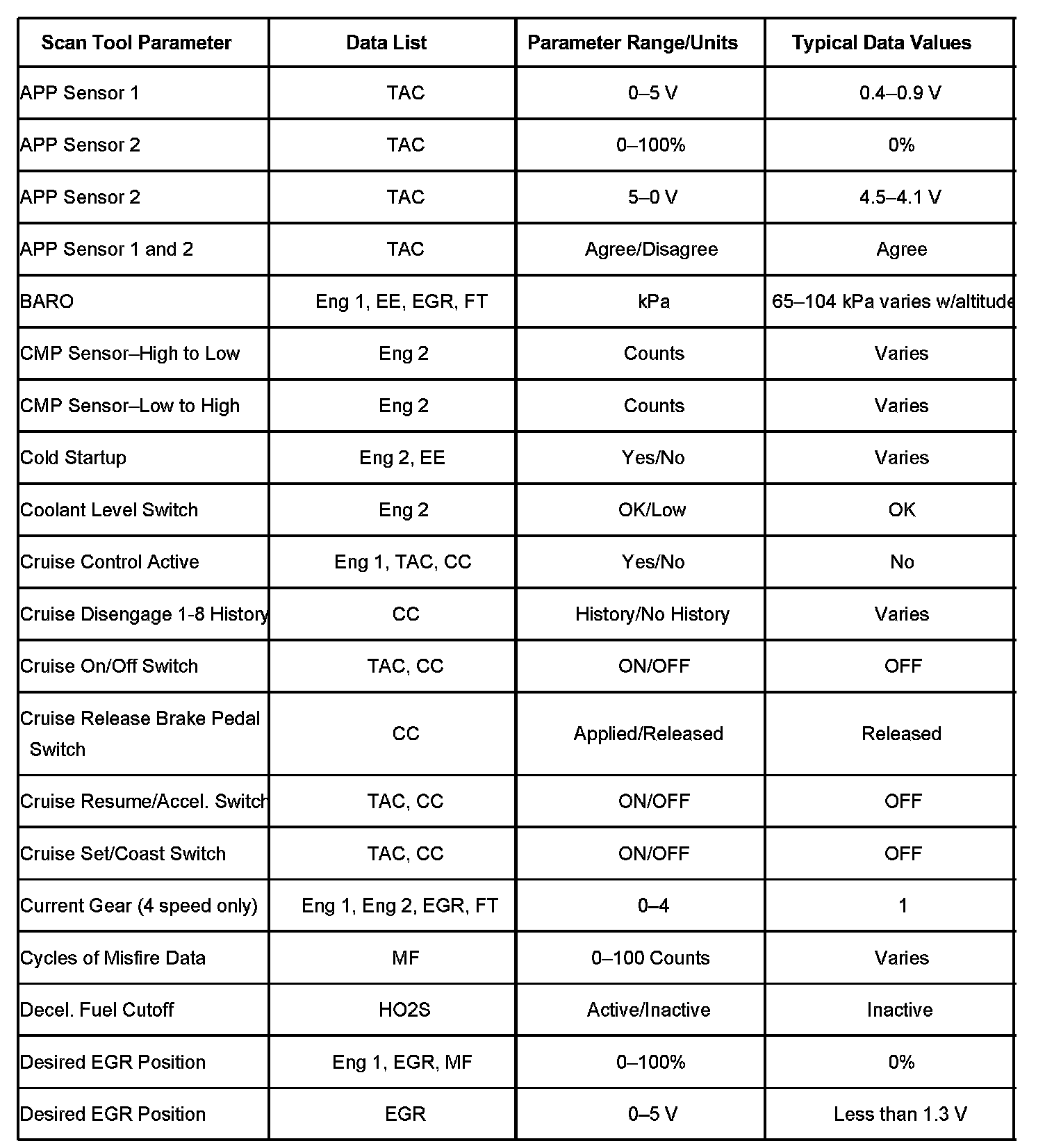 Only the parameters listed below are referenced in this Service Data for use in diagnosis. If all values are within the typical range described below, refer to Symptoms - Computers and Control Systems for diagnosis. Symptom Related Diagnostic Procedures