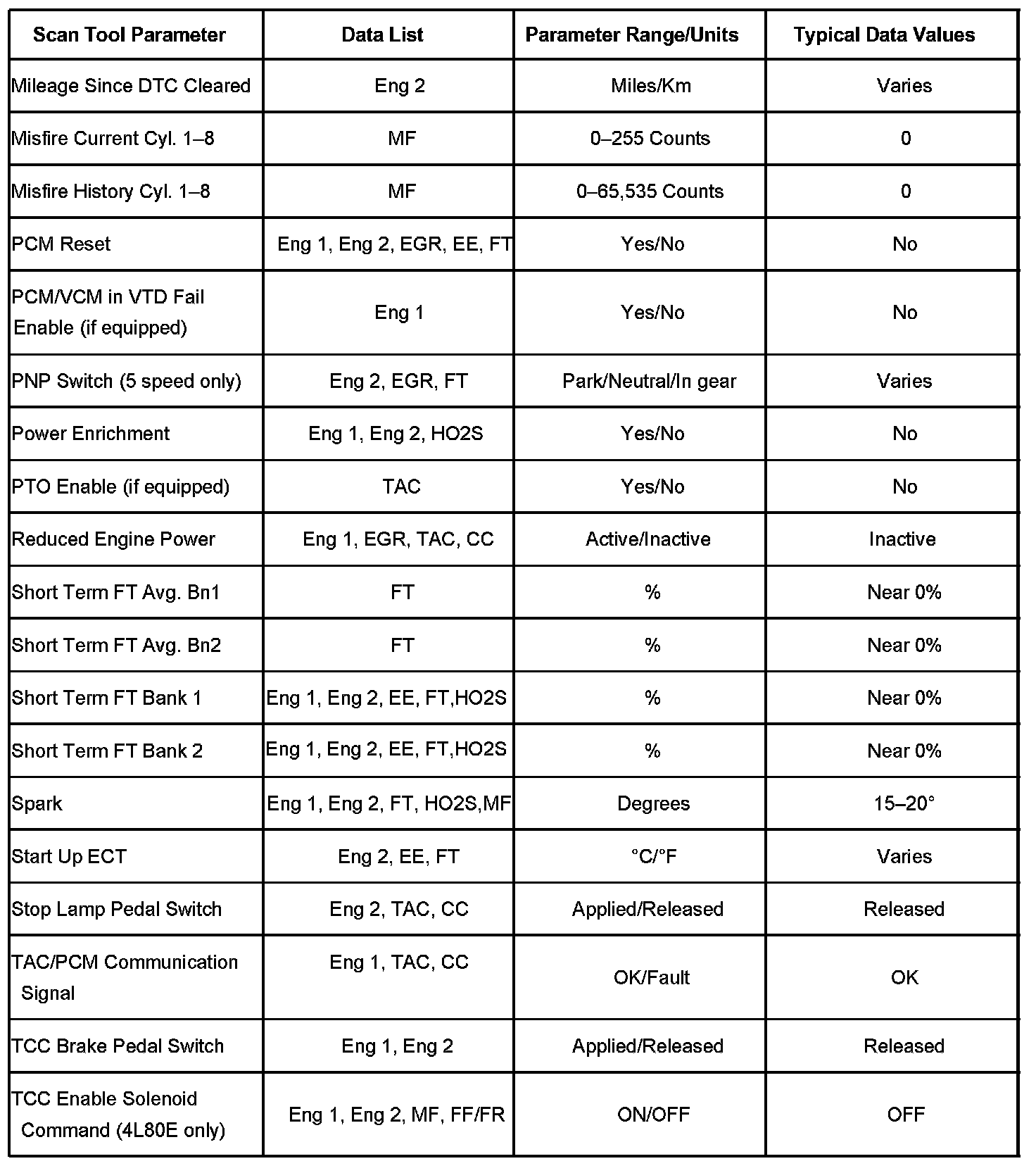 The column labeled Data List indicates where a parameter can be located on the scan tool. Refer to the scan tool operating manual for the exact locations of the data lists. The following is a description of each term listed: