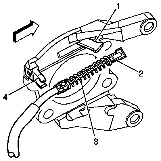 2. Pull rearward on the front park brake cable until the pedal drum (2) reaches its full reset position.