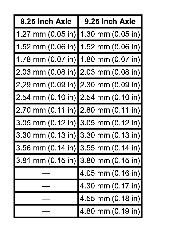 Front drive axle clutch shims are available in the following sizes: