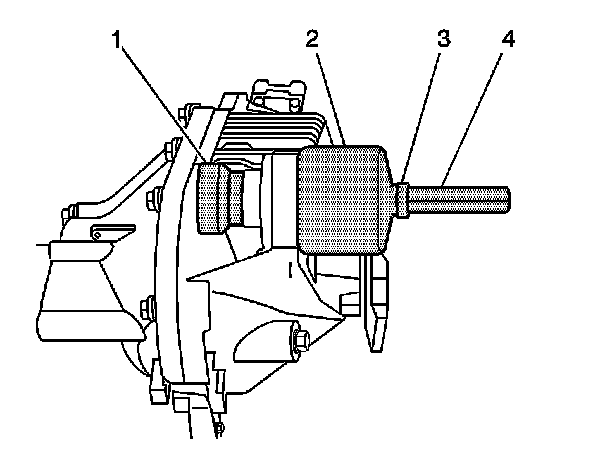 1.1. Install the J 36616-2 (1), the J 33791-1 (2), the thrust bearing (3), the J 21474-18 (4), and the forcing screw as shown.