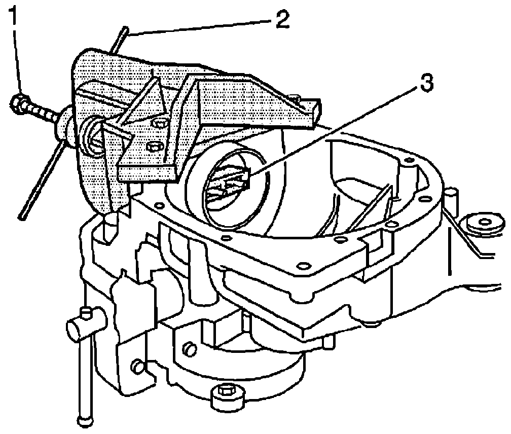 43. Install the J 45858-3 (3), the thrust bearing and the washer (2), and the forcing screw (1) over the outer pinion bearing cup bore.