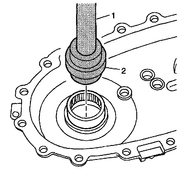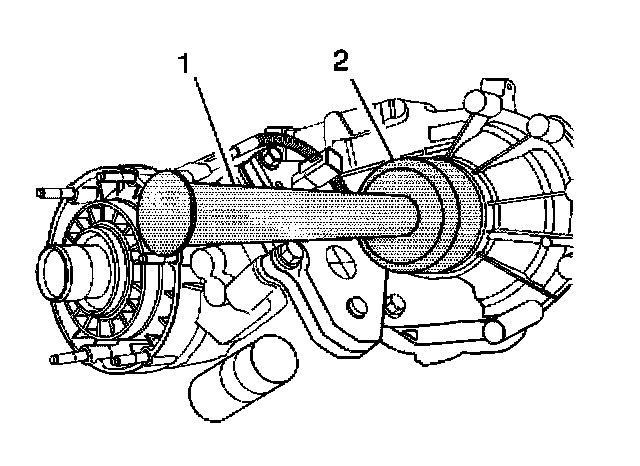 4. Using the J 8092 (1) and the J 36370 (2), install the front output shaft rear bearing.