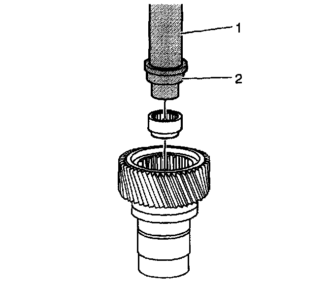 15. Install the needle bearing in the input gear, using the J8092 (1) and the J45383 (2). Use the large diameter of the tool to install the bearing