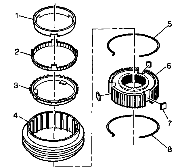 28.3. Install the synchronizer sleeve (4) on the synchronizer hub (6). The sleeve with the taper and groove end aligns to the shorter side teeth of the hub.