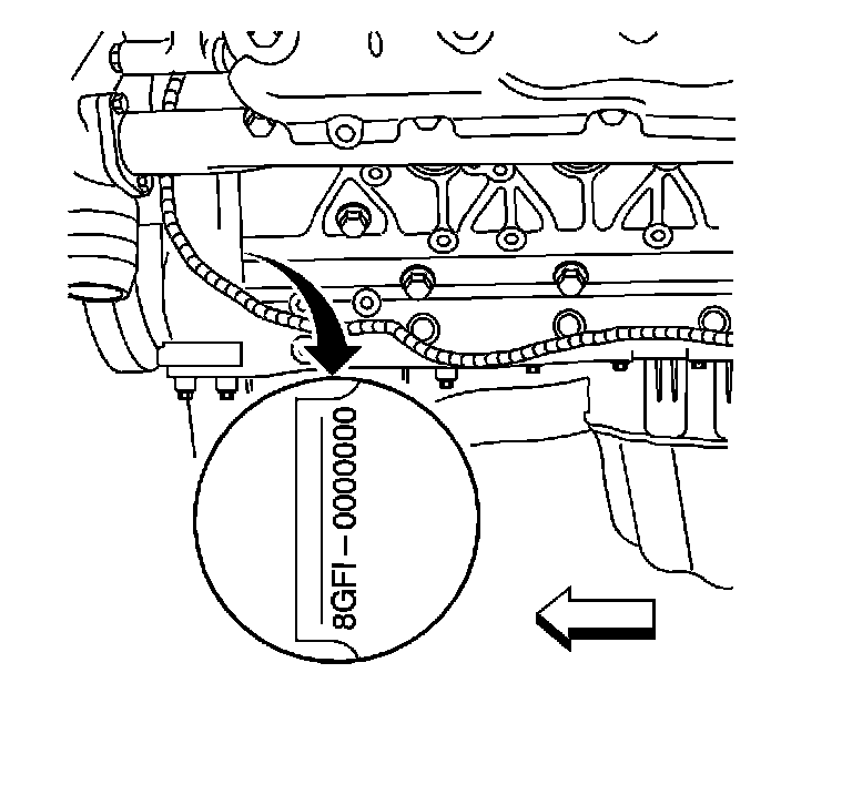 The engine identification tag is located on the left side of the block. It is on the front edge of the block.