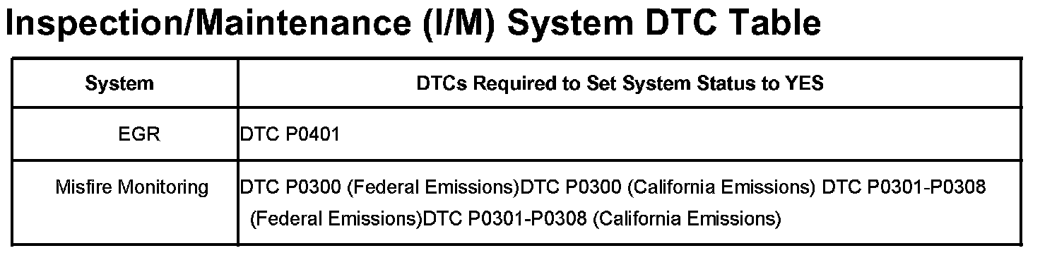 Inspection/Maintenance (I/M) System DTC Table: