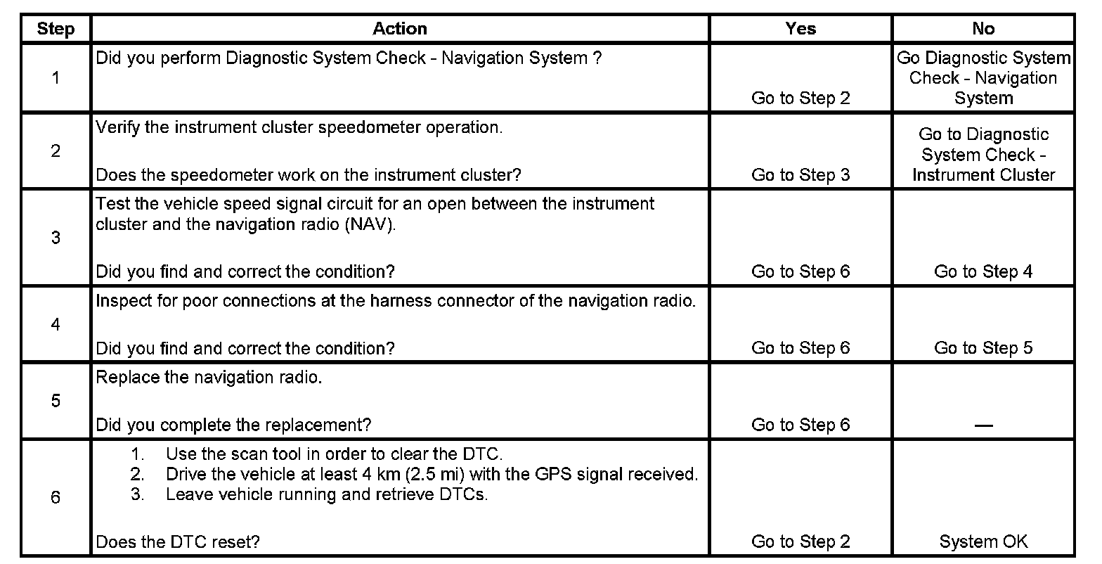 The navigation radio compares the vehicle speed signal from the PCM to the GPS location signal every second. If the GPS signal indicates that the vehicle has traveled 4 km(2.5 mi) but no vehicle speed signal was received, the radio sets the DTC.