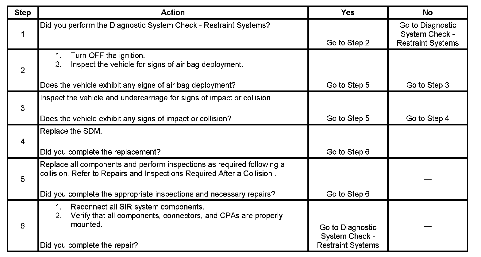 Ignition 1 voltage must be present and the SDM must have commanded an air bag deployment with inflator circuit faults.