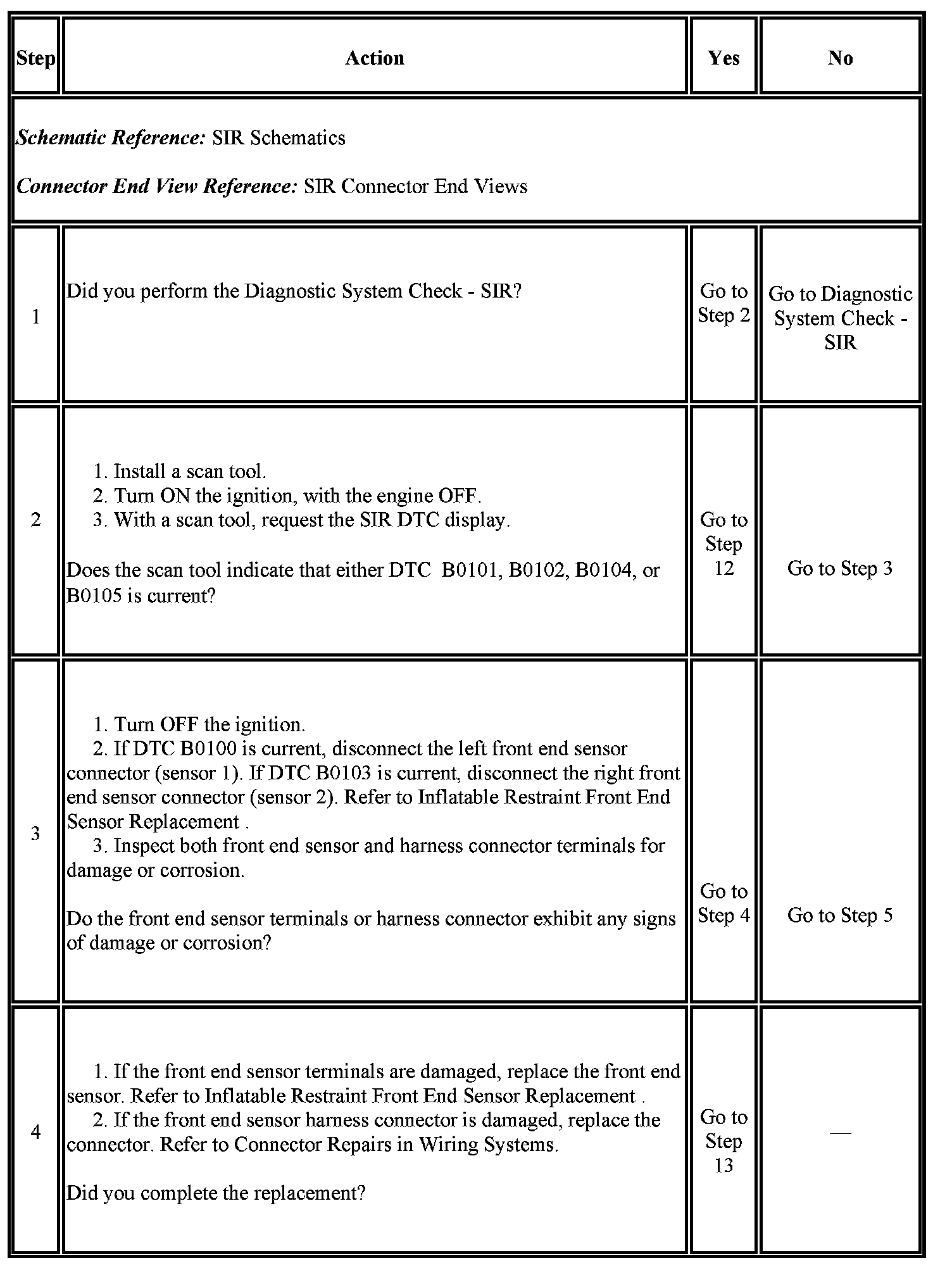 The inflatable restraint front end sensor utilizes a unidirectional 2-wire circuit. The front end sensor modulates current on the interface to send ID, State of Health, and deployment commands to the inflatable restraint sensing and diagnostic module (SDM). The SDM serves as a power source and a ground for the front end sensor. When the ignition is turned on and input power from the SDM is first detected, the front end sensor responds by performing internal diagnostics and sending an ID to the SDM. The SDM considers the ID to be valid if the response time is less than 5 seconds. The front end sensor continually communicates status messages to the SDM, which determines if a fault is present in the front end sensor circuit. When a fault is detected, the SDM resets the front end sensor twice by removing and reapplying power. If the fault is still present, the SDM will set a diagnostic trouble code (DTC).