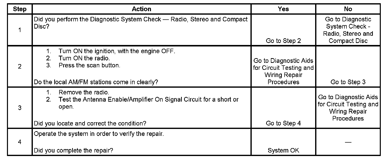 The Antenna Enable/Amplifier On Signal is a class 2 signal sent from the radio through the RSA module, when equipped. The amplifier will reach full output capabilities 900 milliseconds after receiving this signal. The amplifier will then be capable of class 2 functions 60 milliseconds after being turned ON. This DTC will be set if the circuit is shorted to ground or battery.