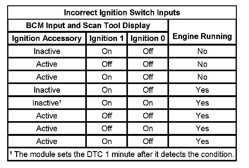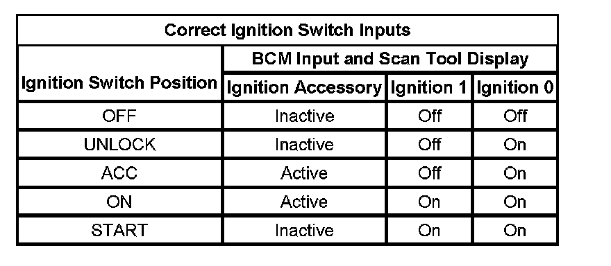 The body control module (BCM) is the power mode master responsible for sending ignition switch position information on the class 2 serial data link. The BCM monitors 3 discrete wires from the ignition switch contacts and the engine run flag (ERF) in order to determine the present power mode. The BCM communicates this power mode information to all class 2 modules on the class 2 serial data link. The shown table represents correct BCM power mode data.