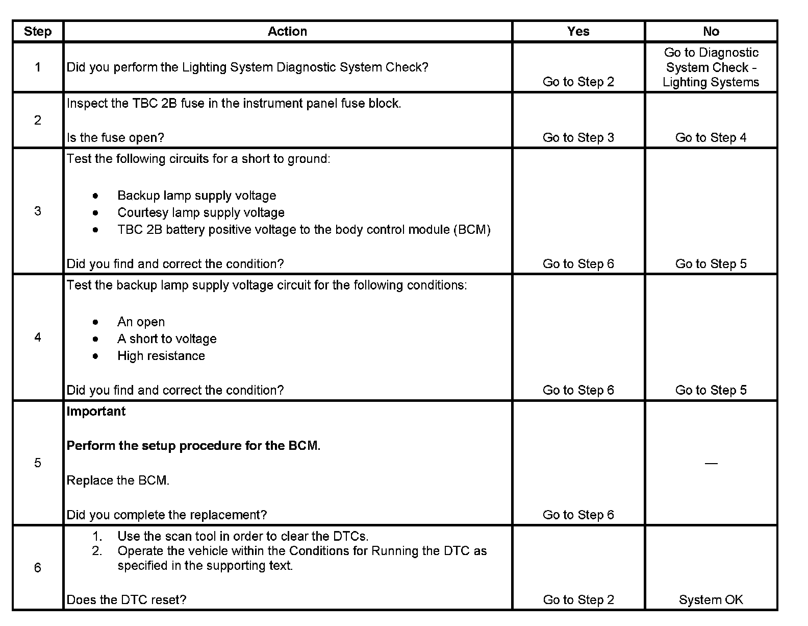 - When the BCM is not receiving a backup lamp request signal and the backup lamp supply voltage circuit is open or shorted to voltage.