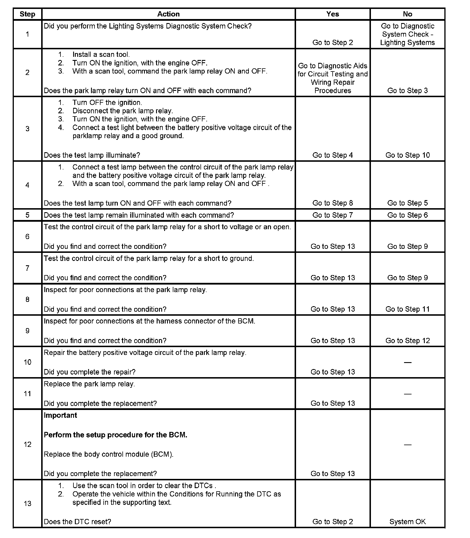 - When the park lamp relay control circuit is open or shorted to ground.