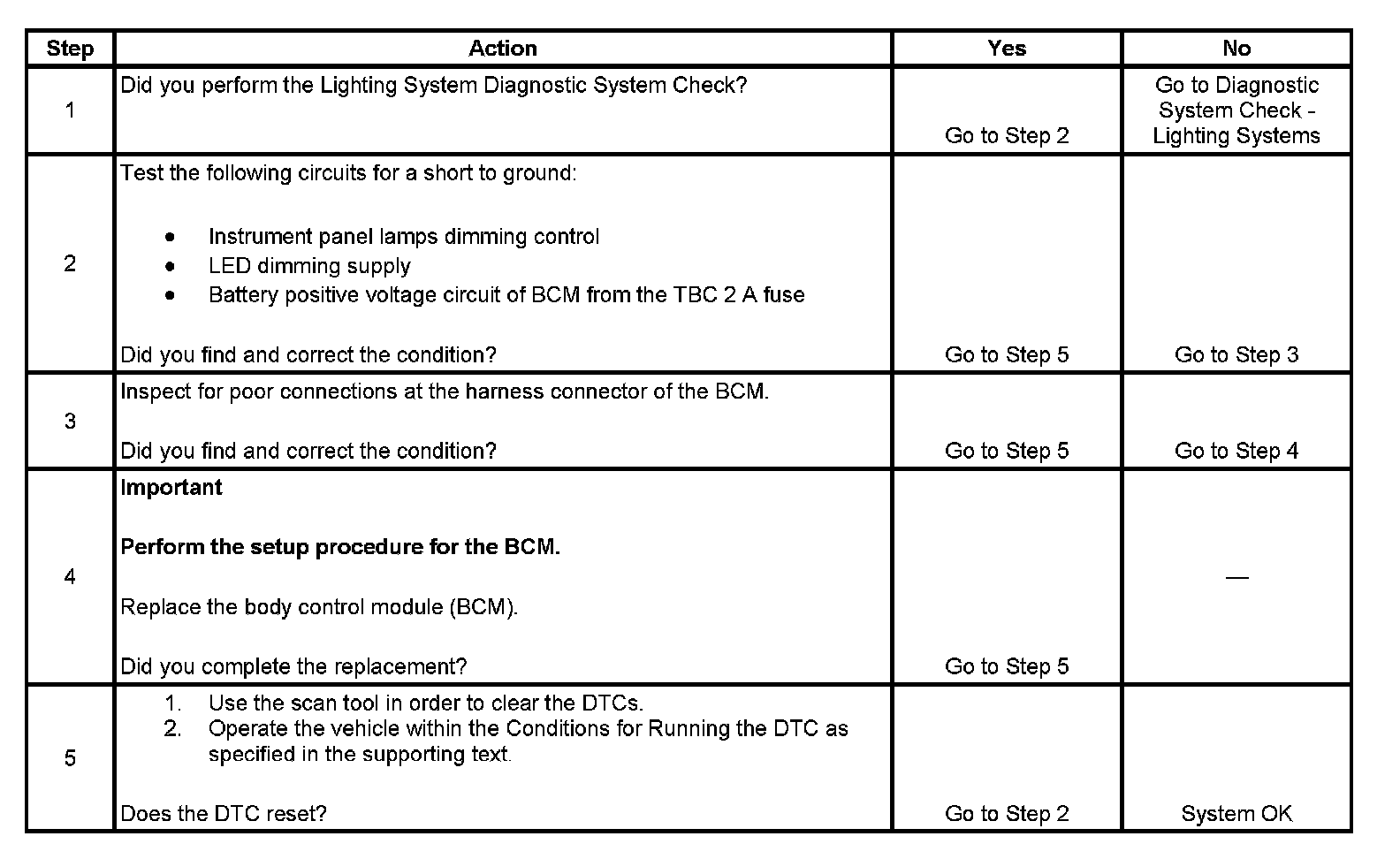 The body control module (BCM) receives a variable voltage signal from the instrument panel (I/P) dimmer switch requesting to illuminate the dimming lamps to a desired intensity. When this occurs, the BCM directly sends a pulse width modulated (PWM) voltage based on the I/P dimmer switch position on the LED dimming supply circuit, instrument panel lamps dimming control circuit, and the instrument panel lamps dimming supply voltage circuit.