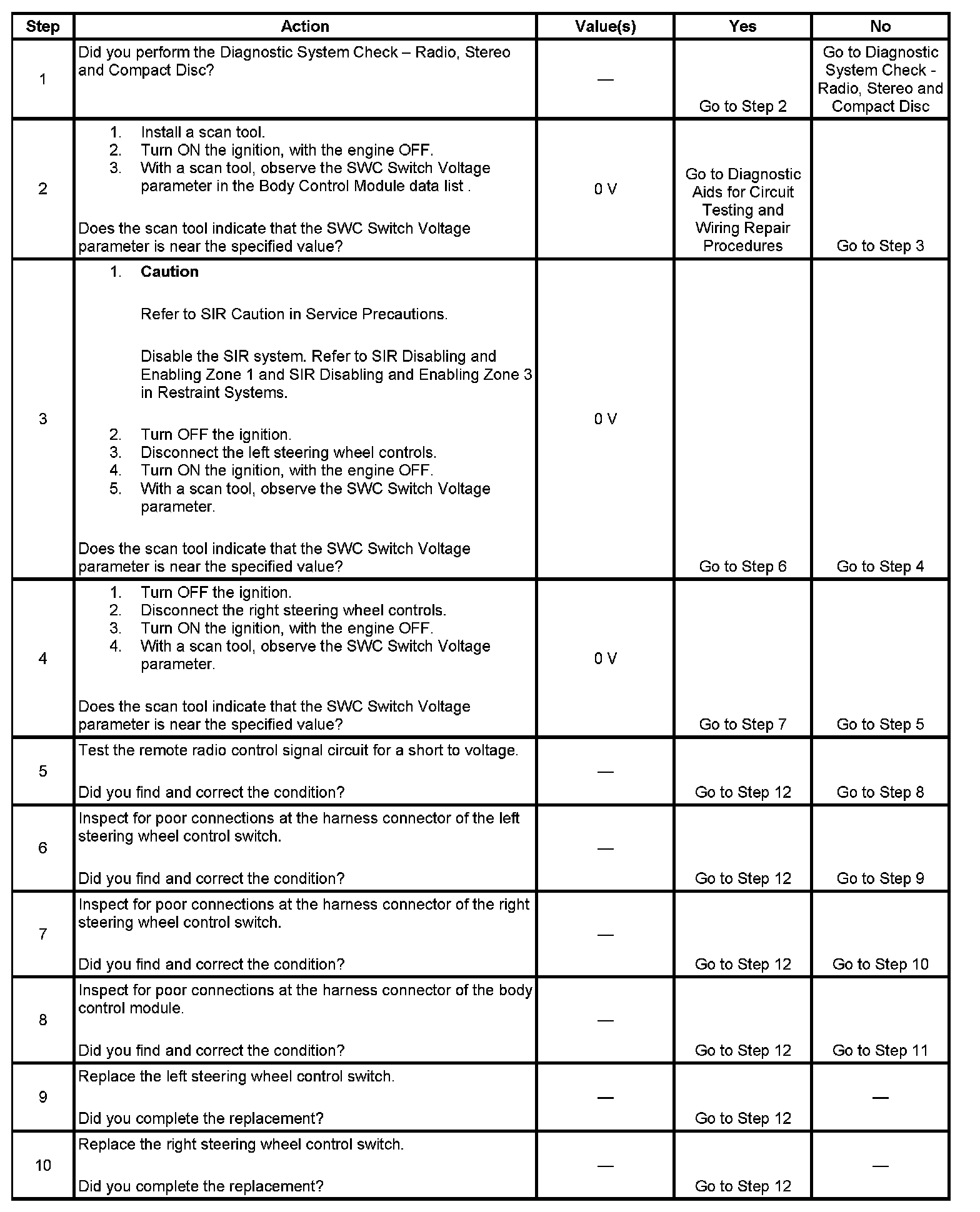 The steering wheel controls are momentary contact switches that connect a series of resistors so that each switch selection corresponds to a fixed resistance value. The body control module (BCM) determines which switch has been pressed by the voltage drop across the corresponding resistance value. The BCM supplies voltage to the steering wheel controls through the rear wiper/washer switch supply voltage circuit. The BCM monitors the switch voltage on the remote radio control signal circuit.