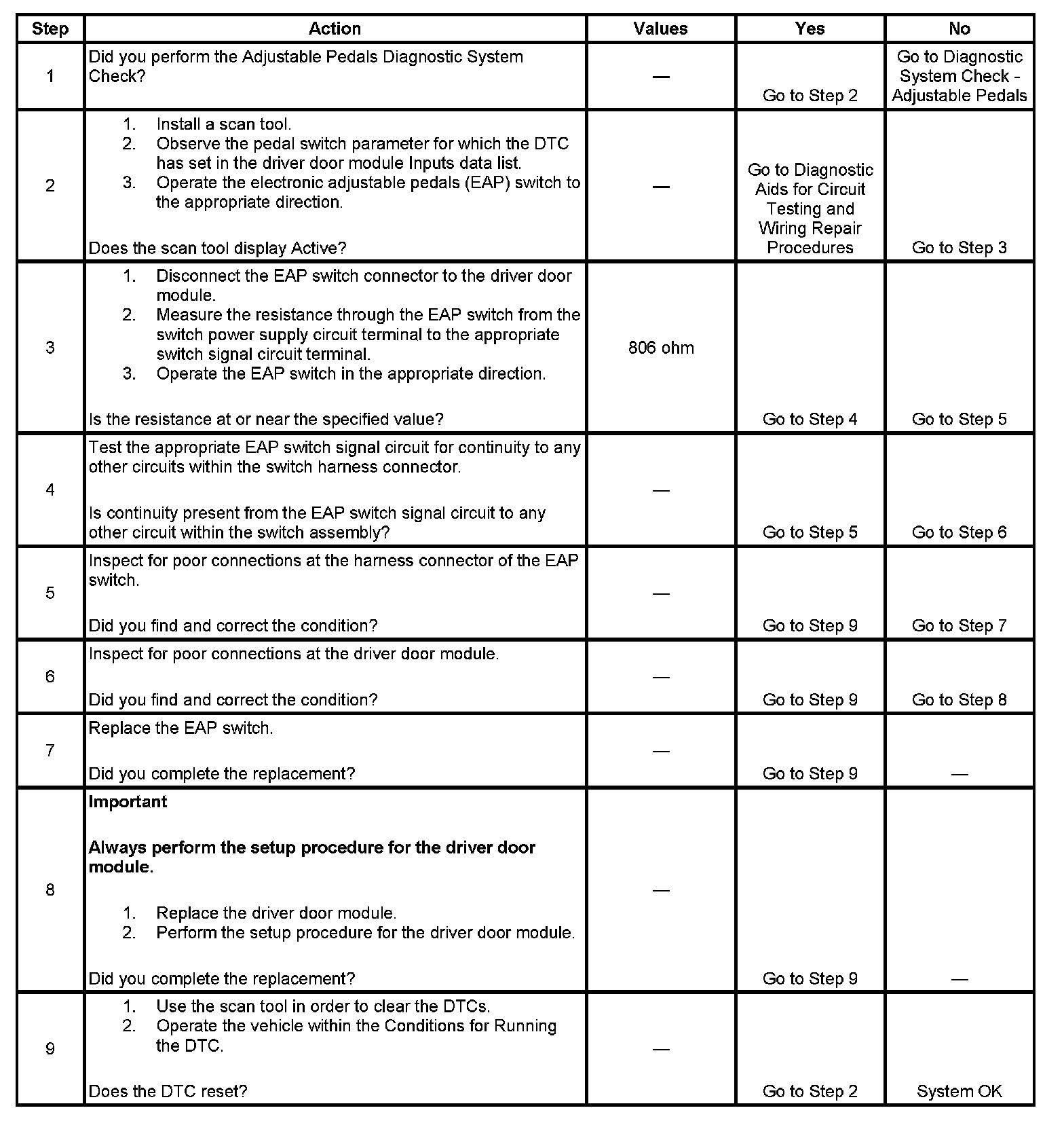The electronic adjustable pedals (EAP) forward and rearward switches are inputs to the driver door module. The driver door module supplies the EAP switch assembly with a battery positive reference voltage. When the EAP switch is operated to the forward or rearward direction the forward or rearward switch signal circuit is closed to the reference voltage. In an active state the EAP forward or rearward switch signal circuit voltage is supplied to the driver door module through one of the 806 ohm resistors within the switch assembly. The resistors in the switch assembly enables the driver door module to recognize an invalid switch signal.