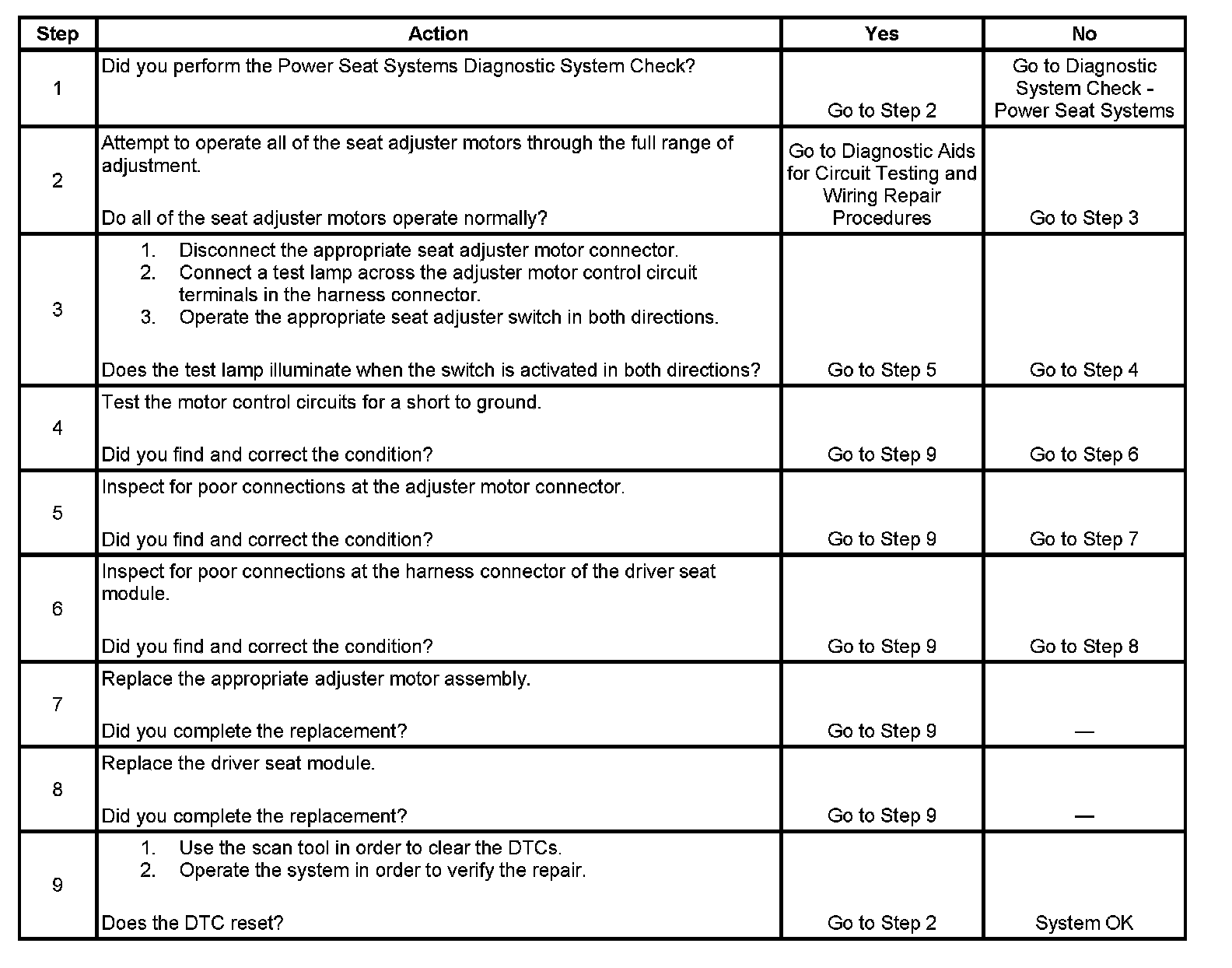 When an adjuster motor control circuit is shorted to ground the driver seat module will also set a DTC for the affected motor.