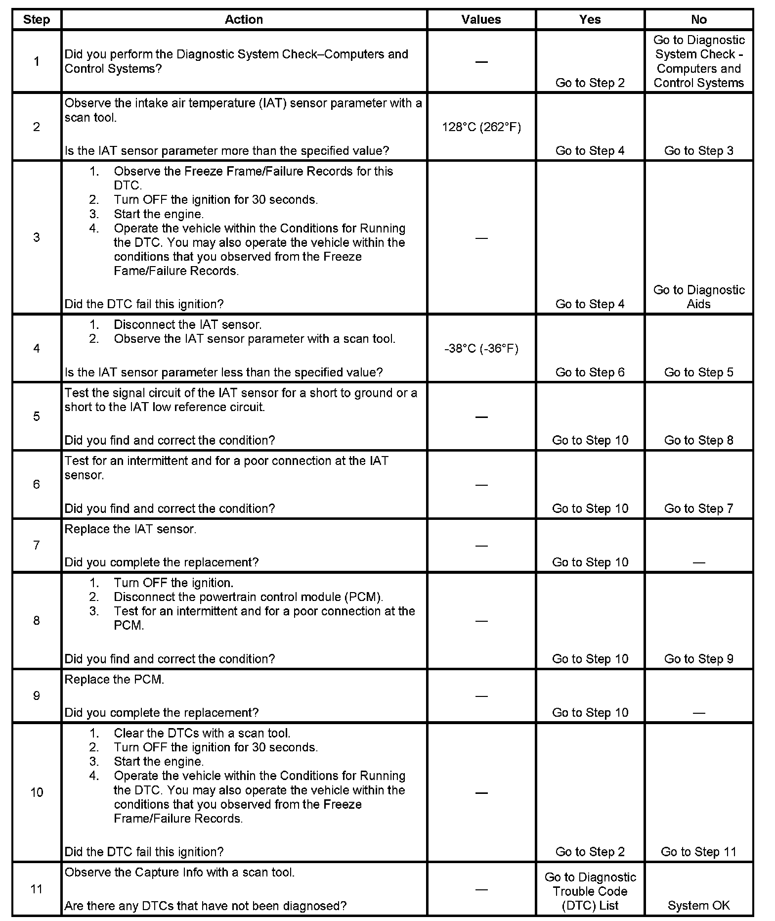 The PCM detects that the IAT Sensor parameter is more than 128°C (262°F) for 5 seconds.