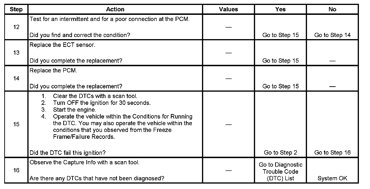 The engine coolant temperature (ECT) sensor is a variable resistor, that measures the temperature of the engine coolant. The ECT sensor has a signal circuit and a low reference circuit. The powertrain control module (PCM) supplies 5 volts to the ECT signal circuit and a ground for the ECT low reference circuit. When the ECT is cold, the sensor resistance is high. When the ECT increases, the sensor resistance decreases. With high sensor resistance, the PCM detects a high voltage on the ECT signal circuit. With lower sensor resistance, the PCM detects a lower voltage on the ECT signal circuit. If the PCM detects an excessively high ECT signal voltage, which is a low temperature indication, DTC P0118 sets.